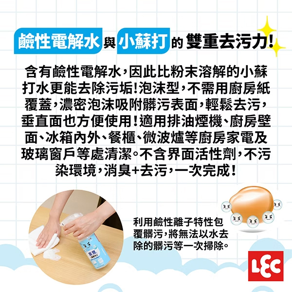 ●泡沫型 ●鹼性電解水+倍半碳酸鈉 ●廚房油污&牆面手印或煙漬 ●除菌+消臭+去污 ●日本製
