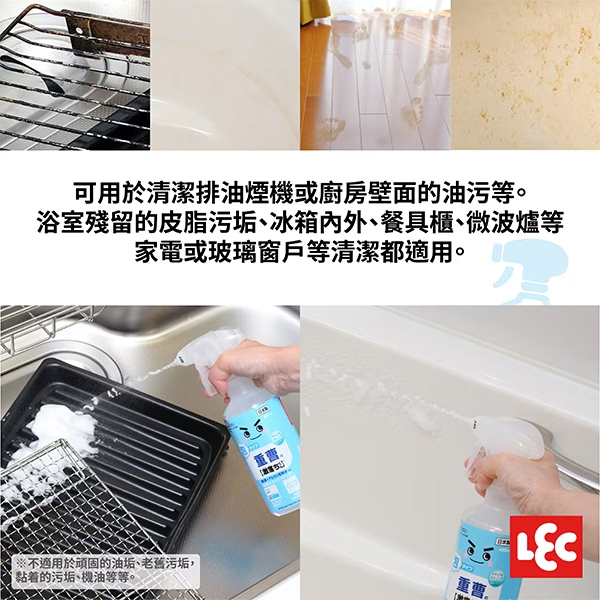 7.適用於排油煙機、廚房壁面、浴室皮脂污垢、冰箱內外、餐具櫃、微波爐等家電或玻璃窗戶等處髒污清潔。 ※不適用於頑固的油垢、老舊污垢,黏着的污垢、機油等等。